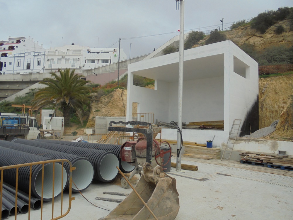 Work is well under way. One of the most obvious signs is the worksite by the escalators. Six months project due to end late June. This poster explains all. I will try to get a better copy at the weekend. The red line marks the course of the new drain to take the river from outside the health centre, through the hill more or less under Oceanville, across the main road near the traffic lights at the top end of Avenida do Ténis, then under the rest of Avenida do Ténis and coming out near the marina below the old cemetery. The yellow line is the existing river tunnel under the old town. This will be intercepted near the square and channelled into the new capture by the escalators that's under construction behind the fences. Various thin lines show existing and new drains to join up with it.